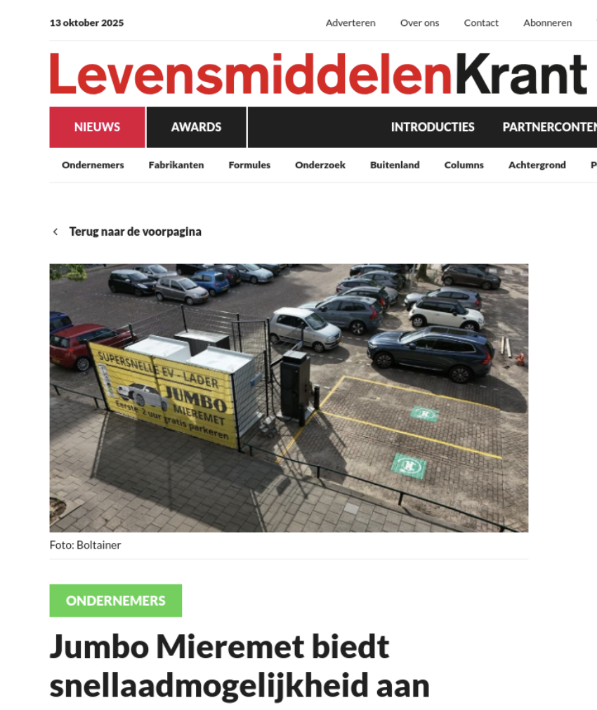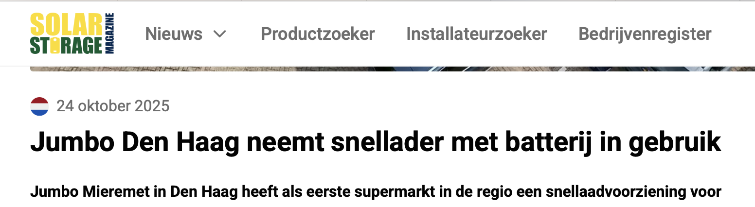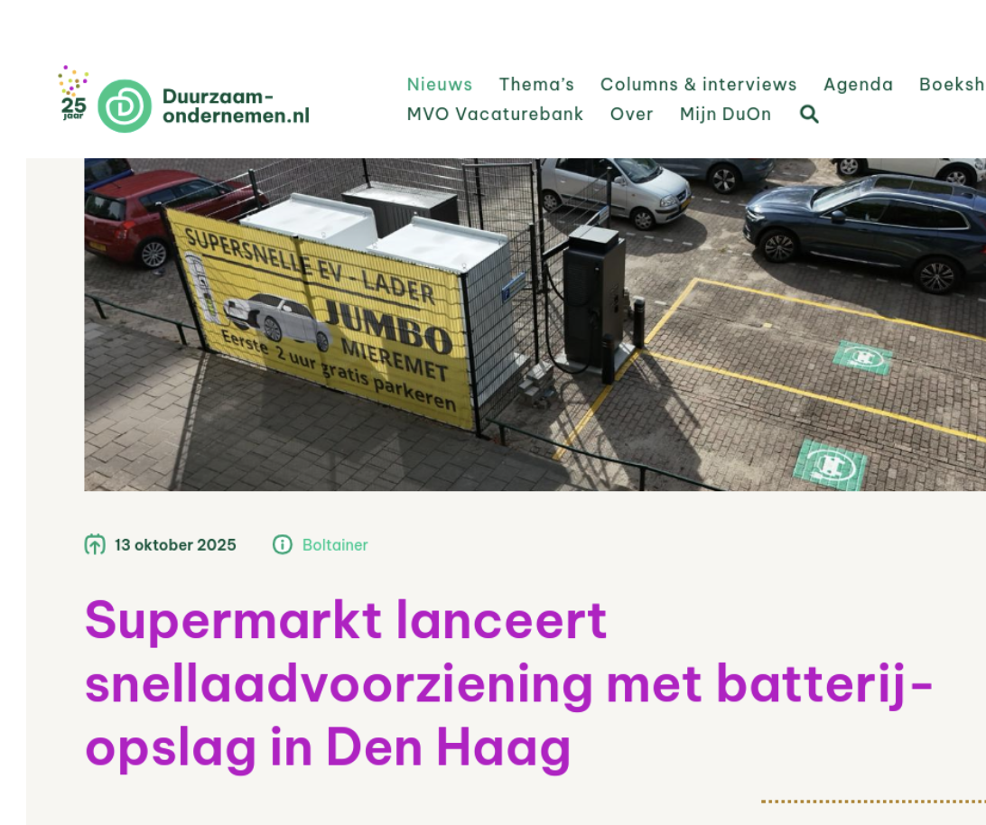 In Nederland is snelladen in opmars: Nederland telt nu zo’n 3.000 snelladers, maar de verwachting is dat dit richting 2030 groeit naar 10.000. Jumbo Mieremet in Den Haag speelt hierop in met de plaatsing van twee snellaadpalen op het parkeerterrein van het winkelcentrum waarin de supermarkt gevestigd is. De twee BBOLT-batterijen die aangesloten staan op de laadpalen laden op wanneer er stroom van het net over is, zodat klanten van de supermarkt en passanten altijd hun auto kunnen opladen. Met dit project markeert de supermarkt een unieke positie, aangezien er in Den Haag nu in totaal twee snellaadlocaties aanwezig zijn.