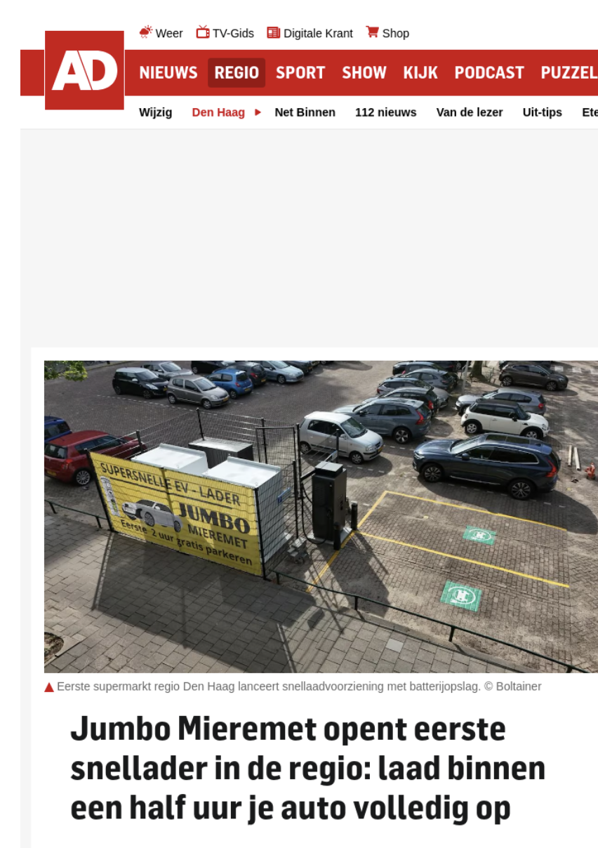Daarnaast werd het project lokaal uitgelicht door het AD Haagsche Courant, zowel online als in de gedrukte editie. Daarmee wordt het belang van snellaadvoorzieningen in de regio onderstreept.