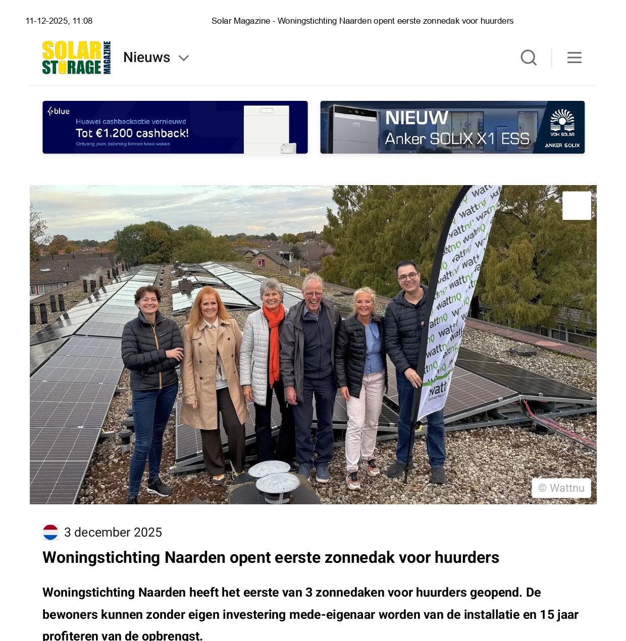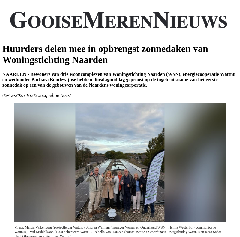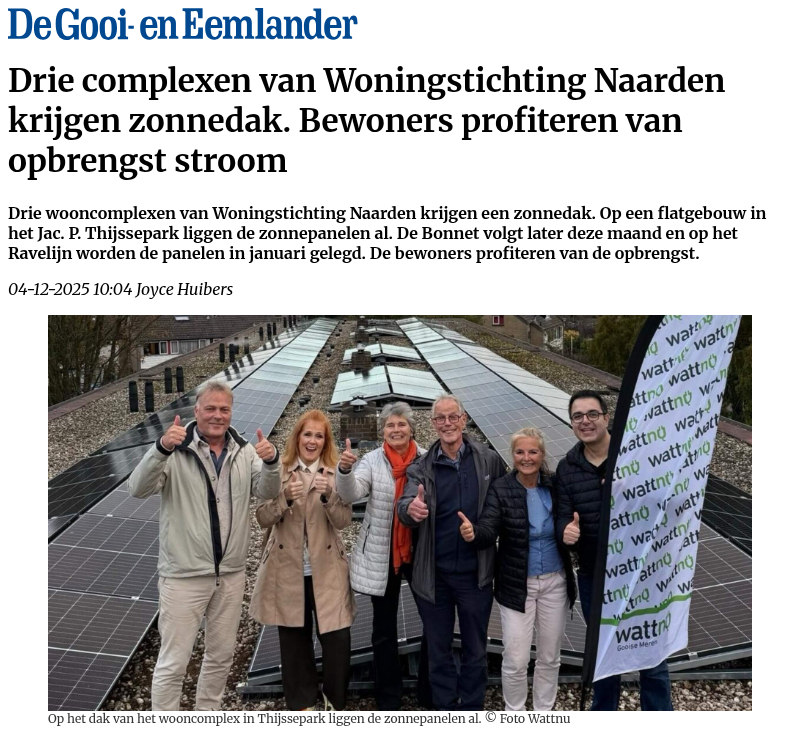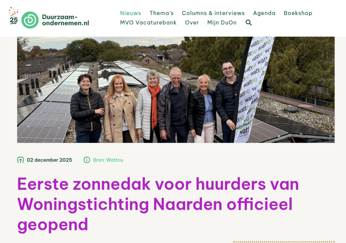 In Naarden is het eerste zonnedak van Woningstichting Naarden deze maand officieel geopend. Huurders van het wooncomplex kunnen 15 jaar lang profiteren van de opbrengst van de zonnedaken, zonder zelf te hoeven investeren. Met dit project werken WSN, energiecoöperatie Wattnu en gemeente Gooise Meren samen aan verduurzaming.